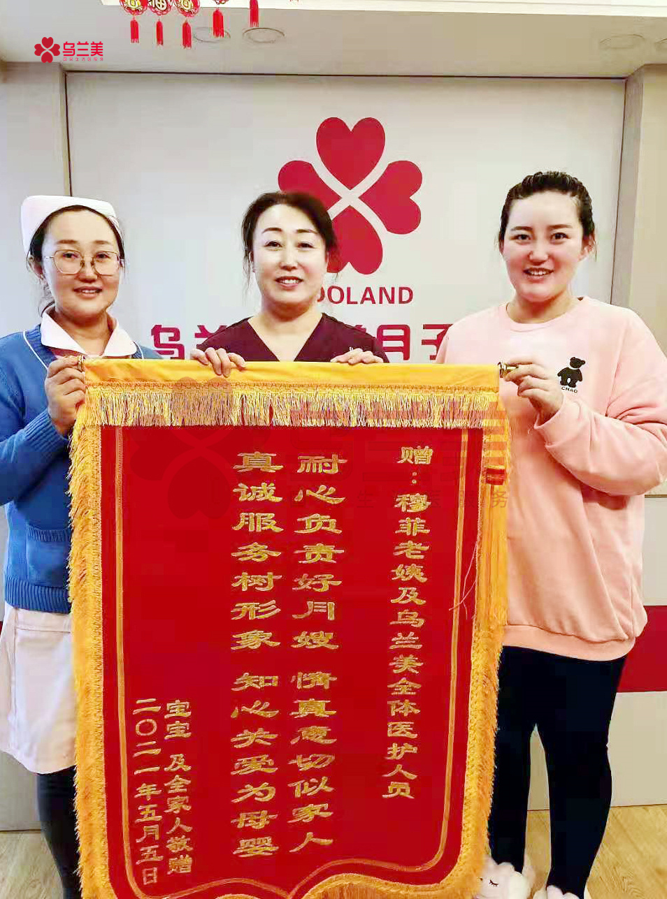5月5日一大早,烏蘭美醫(yī)養(yǎng)月子中心的每一位母嬰護(hù)理師和工作人員的臉上,都洋溢著幸福的笑容??蛻粼S娜一家將一面印有“耐心負(fù)責(zé)好月嫂,情真意切似家人,真誠(chéng)服務(wù)樹(shù)形象,知心關(guān)愛(ài)為母嬰”的錦旗,親自送到了烏蘭美醫(yī)養(yǎng)月子中心母嬰護(hù)理師穆菲(簡(jiǎn)稱,穆姐)手里,以此感謝她對(duì)寶媽和寶寶無(wú)微不至的關(guān)懷與照護(hù),并對(duì)烏蘭美健康集團(tuán)的正規(guī)和專業(yè)表示了認(rèn)可!